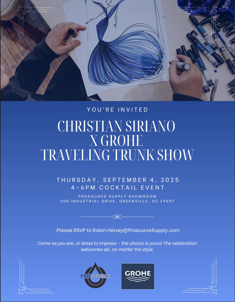 Prosource is hosting an exciting event at our Greenville branch on Sept 4th, and I’m eager to spread the word! Christian Siroano has partnered with Grohe (faucet company) to create a stunning showcase of designs. The concept is for him to select faucets that reflect the style of his own fashion collections. Christian Siroano is an American fashion designer who won Project Runway in 2007. As part of this collaboration, he’s allowing us to borrow some of his dresses to display in our showroom during a cocktail hour we’re hosting. You can find more about this partnership through the link below.