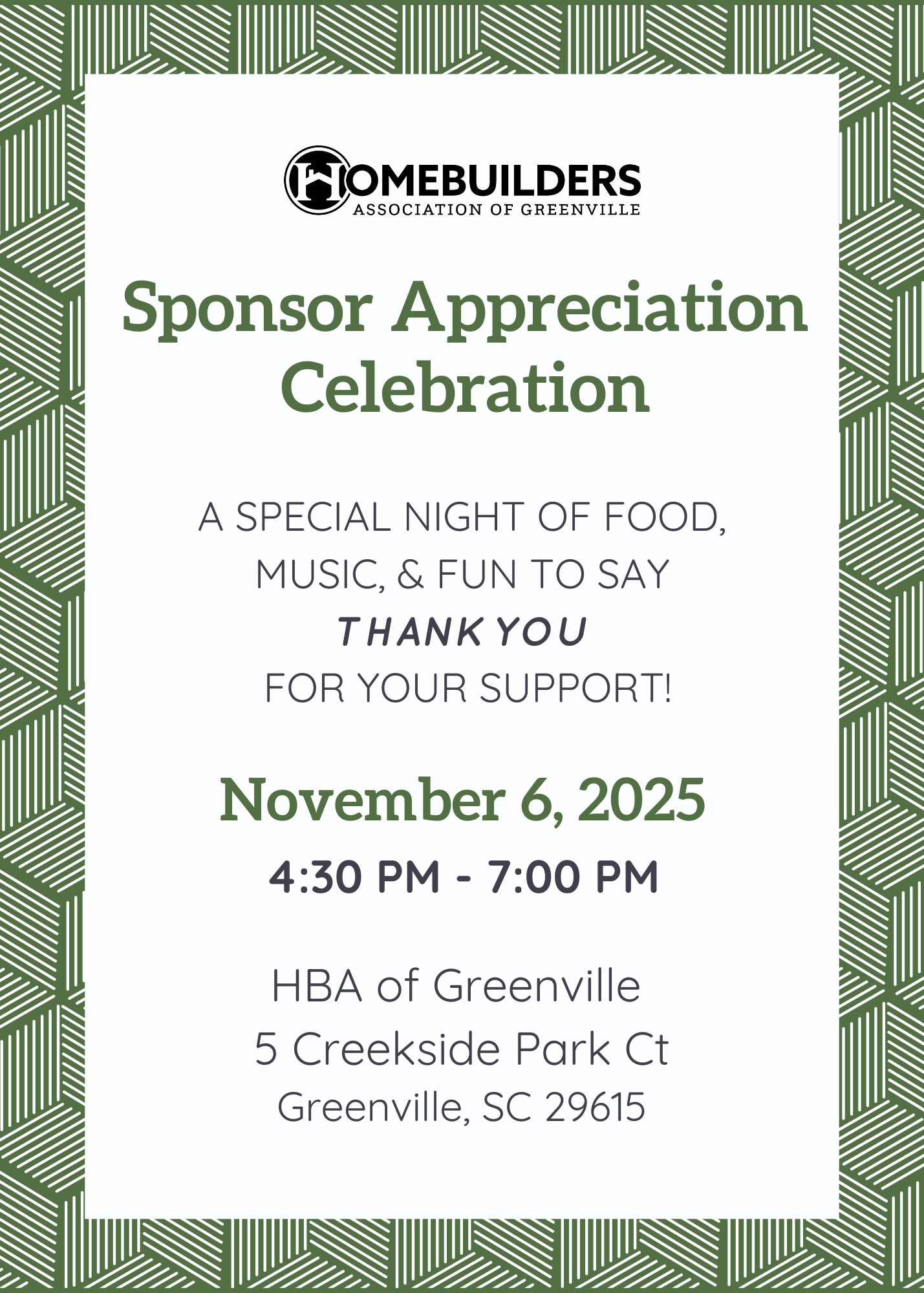 The HBA of Greenville invites our 2025 Sponsors to our Sponsor Appreciation event on November 6th from 4:30 pm - 7 pm as we say Thank You for your continued support of the HBA of Greenville.